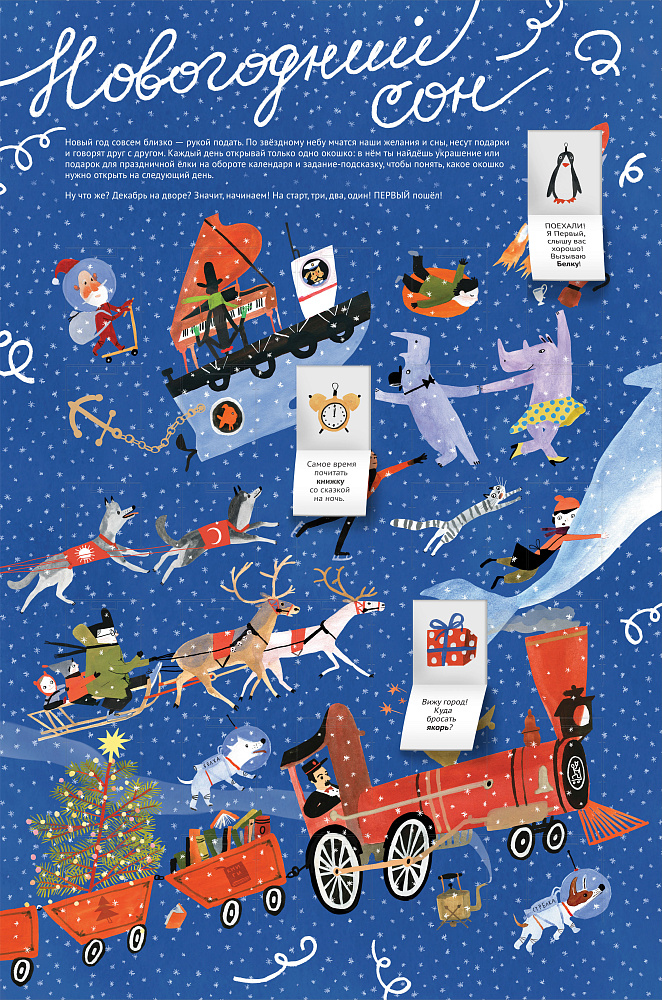 Новый год совсем близко — рукой подать. По звездному небу мчатся наши желания и сны. Для каждого декабрьского дня — своё окошко, под которым спрятана наклейка. На ней нарисован подарок или игрушка для праздничной ёлки, а может быть, что-то совсем неожиданное — потерянная шапка или даже спасательный круг! И открывать окошки нужно не по порядку. Под каждым из них будет загадка-подсказка, которая поможет открыть вам нужное окошко на следующий день. 31 окошко, 31 наклейка, 31 загадка подарят вам волшебный месяц ожидания Нового года.