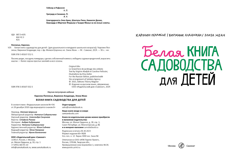 <p> Ты умеешь сажать редиску? А делать компост? Теперь вне зависимости от сезона – на балконе, в саду или огороде, летом, зимой, осенью и весной мы знаем что делать: сажаем семена, выращиваем, собираем урожай и пробуем собственные овощи! Пятьдесят доступных и веселых активностей, чтобы дети в городах и деревнях могли познать радости копания в земле. В смысле, садоводства! </p> <h2>5 причин купить книгу «Белая книга садоводства для детей»:</h2> <ul> <li> <p> Книга охватывает все 4 сезона – осень, зиму, весну и лето. Будет чем заняться не только в тёплое время года! </p> </li> <li> <p> Доступные пошаговые инструкции сопровождаются пояснениями, как устроены растения и цикл роста, а также основными принципами садоводства; </p> </li> <li> <p> Эта большая красочная книга с подробными смешными рисунками Элизы Жеан может стать отличным подарком всем, кого тянет покопаться в земле; </p> </li> <li> <p> Не только занимаемся растениями, но и мастерим кормушки, компост, рождественские украшения и многое другое; </p> </li> <li> <p> Книга посвящается нашей Земле и внимательному отношению к окружающему миру: мы учимся не просто сажать семена, но помогать растениям, животным и птицам – своими руками. </p> </li> </ul>