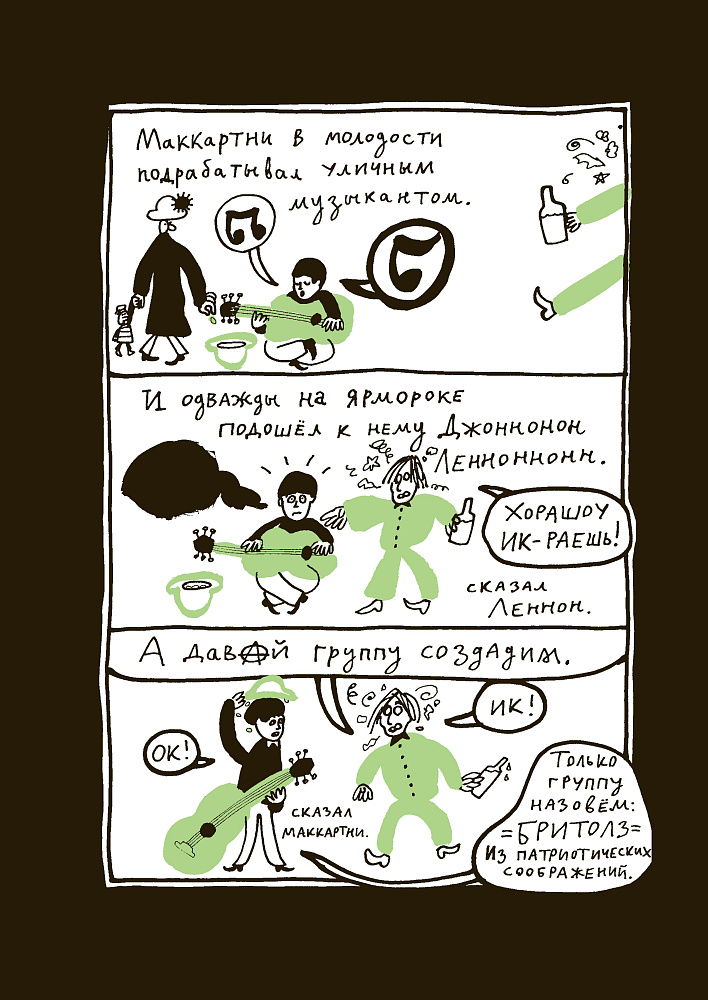 Britolz — пародийные стрипы о группе-клоне ливерпульской четверки с Джоном Ленононом в главной роли. От смеха тут и правда можно попасть в больницу.