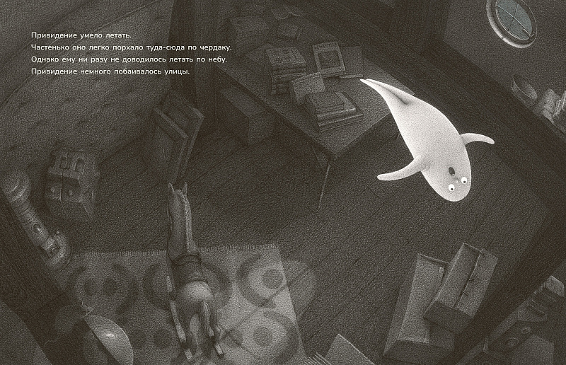 Маленькое привидение долго и счастливо обитало на чердаке. Жители дома и не подозревали, что под крышей кто-то живёт. Всё потому, что привидение проявляло чудеса маскировки, то становясь прозрачным, то уменьшаясь до размеров спичечного коробка, да и вело оно себя тихо.