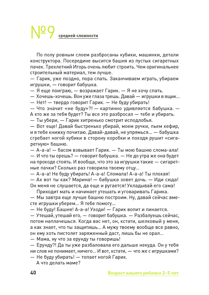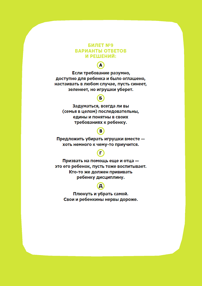 Билеты в нашем экзамене поделены на три части, по пятнадцать вопросов-ситуаций в каждой. В первой части семейные истории касаются детей от двух до пяти лет. Во второй — от шести до одиннадцати лет. И, наконец, в третьей части — ситуации, в которых участвуют подростки (от двенадцати до шестнадцати лет).