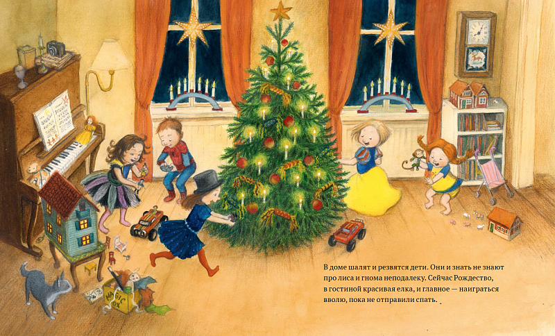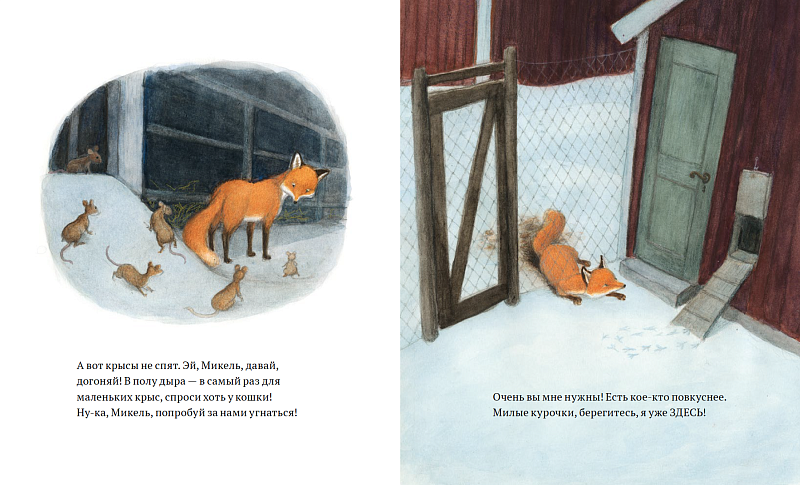 Зимняя ночь. Лис Микель подкрадывается к хутору, а в доме у рождественской елки играют дети. В сарае спят вкусные курочки. Но Лису до них не добраться — вот уже сто лет за хутором присматривает гном. Он объясняет Микелю: кур трогать нельзя. Но что тогда есть лису? Не беда: дети уже выставили для гнома рождественскую кашу, которой тот не прочь поделиться. Оказывается, это не хуже, чем курицы. Сытый лис спешит домой, а в небе восходит утренняя звезда.