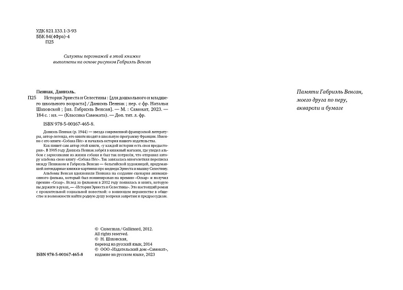 Альбомы Венсан вдохновили Пеннака на создание сценария анимационного фильма, который был номинирован на премию «Оскар» и получил премию «Сезар». Вслед за фильмом в 2012 году появилась и книга, которую вы держите в руках, — «История Эрнеста и Селестины». Это настоящий роман с пронзительной социальной повесткой: о вопиющем неравенстве в обществе и возможности найти родную душу вопреки запретам и предрассудкам.