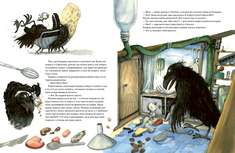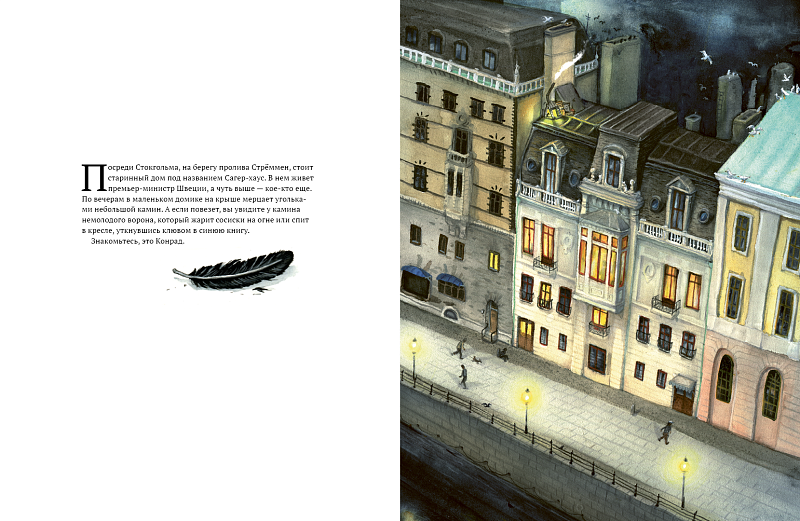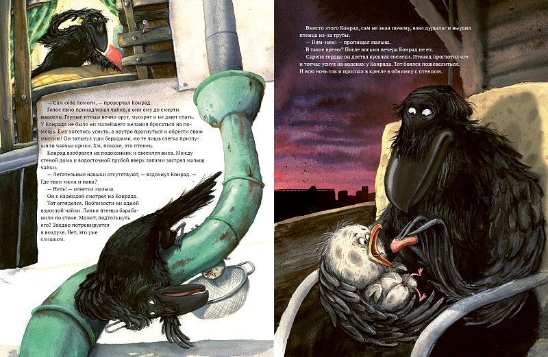<p> На крыше маленького домика посреди Стокгольма живет ворон Конрад. По вечерам он жарит сосиски на огне или спит в кресле, уткнувшись клювом в книгу. Но однажды тишину нарушают крики о помощи: только этого не хватало, птенец чайки выпал из гнезда и потерялся! Конрад не любит чаек, он хочет как можно скорее найти родителей и избавиться от вечно голодного птенчика. Но это не так уж и просто, дело принимает детективный оборот! </p> <p> Решить загадку Конраду помогут сова миссис Хадсон и чайка Кармэн, которая работает дирижером в птичьем хоре оперного театра Стокгольма. </p> <p> В этой книге — первой в серии юмористических детективов — Конрад находит свое жизненное призвание и становится сыщиком. </p>