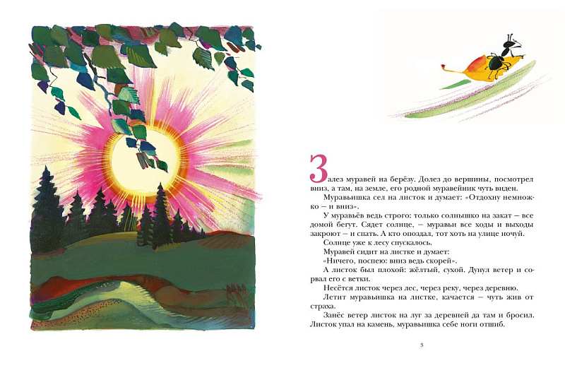 В познавательной сказке замечательного русского писателя-анималиста Виталия Бианки говорится о любопытном муравье, который забрался на дерево да и улетел с порывом ветра на березовом листочке далеко от муравейника. Ему надо добраться домой до захода солнца, иначе он не сможет попасть внутрь.<br> <br> Все бы ничего, но путь осложняет травмированная ножка. Муравьишку «везут» домой, сменяя друг друга, гусеница-землемер, паук-сенокосец, жужелица, блошачок, кузнечик, водомер, майский жук, гусеница-листовертка. В конце концов муравей попадает в свой муравейник и успевает забежать в последний открытый лаз.<br> <br> Украшение книги – иллюстрации Льва Токмакова. Существовало несколько изданий сказки с рисунками художника. К сожалению, полных комплектов оригинальных иллюстраций не сохранилось. Мы подготовили новое издание книги, бережно отреставрировав и объединив уцелевшие оригиналы от предыдущих изданий.<br> <br> Сказка понравится детям дошкольного и младшего школьного возраста.<br>