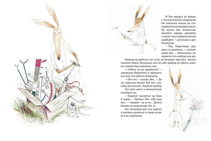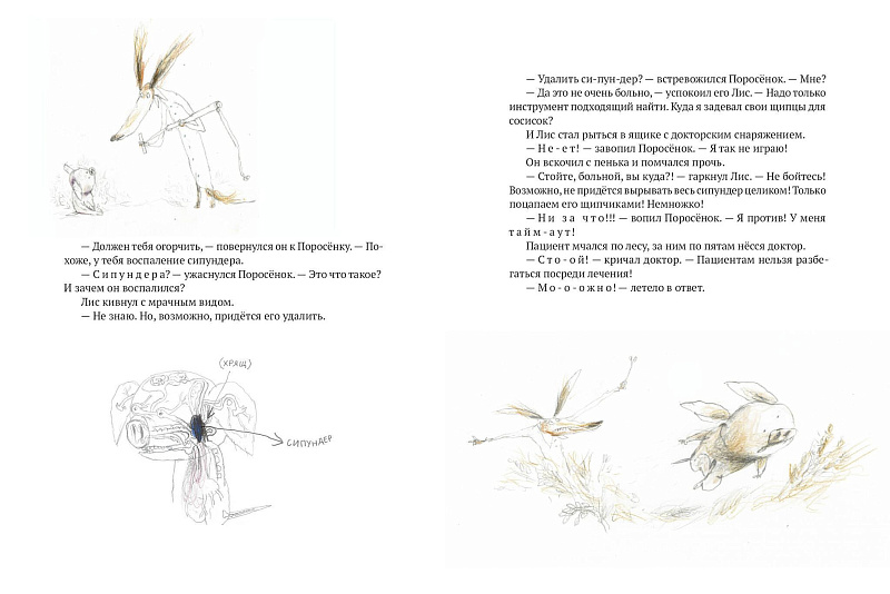 Долгожданное пополнение в серии уморительно<br> смешных историй о Лисе и Поросёнке! Лис и Поросёнок затеяли новую игру. Поросёнка<br> сразила неизвестная болезнь. Доктора! Скорее! И доктор незамедлительно приходит на помощь — в белом халате и с хворометром в руках. Оказывается, у Поросёнка воспалился сипундер, его придётся удалить. Немедленно! Щипцами! Но Поросёнок категорически и громко не согласен. Пусть лучше у него будет леопардоз, который лечат газировкой и<br> булочками. Только и в этой истории всё пойдёт не так, как задумали Лис и Поросёнок!<br> <br> <i>  — Не-ет! — завопил Поросёнок. — Я так не играю!</i><br> <i> </i><br> <i>  Он вскочил с пенька и помчался прочь.</i><br> <i> </i><br> <i>  — Стойте, больной, вы куда?! — гаркнул Лис. </i><br> <i> </i><br> <i> — Не бойтесь! Возможно, не придётся вырывать весь сипундер целиком! Только поцапаем его</i><br> <i> щипчиками! Немножко!</i><br> <br> Рекомендовано детям и взрослым без ограничений по возрасту. Побочное действие: острый хохотит, временный паралич мышц смеха. Передозировка может вызвать хроническую жизнерадостность.<br> <br> Ранее в серии «Другие истории о Лисе и Поросенке» вышли «Акулиска - враг редиски» и «Кафе «Птичий хвост».<br> <br> В Норвегии серия книг о Лисе и Поросенке это самые популярные детские аудиокниги на<br> ресурсе Storytel из всего ассортимента. В России первые книги  серии вышли в июне 2019 года и сразу стали бестселлерами издательства «Самокат», менее чем за год были неоднократно переизданы. <p> Книги изданы в России при поддержке фонда NORLA - норвежская литература за рубежом. </p> <br> <p> <b>Из отзывов прессы:</b> </p> <p> <i>Есть такая примета: если скандинавскую книжку на русский язык перевела Ольга Дробот — то это непременно шедевр и будущий бестселлер. Так было с книгами Марии Парр, так было с «Простодурсеном» Руне Белсвика. Нет никаких сомнений, что именно такая судьба ждет серию книг (всего их 12, но в России вышли пока только две) про Лиса и Поросенка. Лис и Поросенок не противники, как Волк и Заяц из «Ну, погоди!», а приятели. Как Винни-Пух и Пятачок, как Малыш и Карлсон, как Петсон и Финдус, если угодно. Тот факт, что один хищник, а другой — растительноядный, не мешает их дружбе. Они вместе играют (как играли бы дети), выращивают огород, спасая корнеплоды от коварных шнырков-вьюрков, овсянок-кактусянок и прожорливых акулисок. Пытаются заполучить перья из хвостов кукушки-супушки, зяблика-спотыкача, шутихи, русских бородачей и других перелетных птиц. В этих книгах есть все, что так любят в детской литературе юные читатели и даже их великовозрастные родители: уютный герметичный мир человеческого размера, языковая игра и сдержанная ирония.</i> </p> <p>                                                                                                                                        Lenta.ru </p> <p> <i>Бьёрн Рёрвик сочиняет небывалые сюжеты, придумывает новых животных, не боится быть не понятым — если в одном месте юмор не считает ребенок, его обязательно оценят родители. Друзья Лис и Поросенок постоянно попадают в какие-то переделки: ловят зверя, ворующего редиску, гоняются за гигантской кукушкой или таскают йогурт под видом редкой птички. Выбраться из них им помогает мудрая — нет, не сова — корова, которая обожает лазить по деревьям. Во время своих забав Лис и Поросенок сталкиваются с важными вопросами: как мириться, когда ссоришься, какие желания загадывать и как поддер