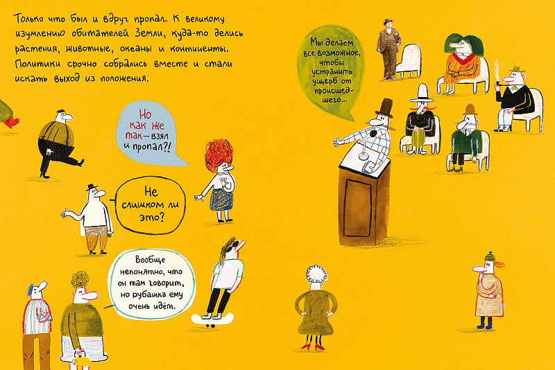 <p> Мир, каким мы его знали раньше, стремительно менялся, пока однажды... не исчез вовсе! Не стало растений, животных, океанов и даже континентов. Жители планеты в удивлении и растерянности пытаются найти выход из сложившейся ситуации. </p> <p> К решению этой проблемы подключаются самые разные специалисты — от политиков и военных до философов, физиков, экологов и поваров. А кто-то ищет поддержки у психологов. </p> <p> Сюрреалистичная и будоражащая воображение юмористическая притча, выполненная в коллажно-комиксовой технике, об актуальных вызовах современности и устойчивом развитии заставит задуматься о важности общих и личных действий для спасения нашей планеты. Чтобы исчезновение мира осталось не более чем шутливым вымыслом. </p>