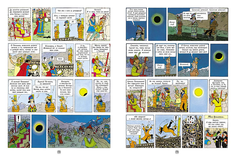 Тинтин и капитан Хаддок прилетают в Перу. Они полагают, что профессор Турнесоль находится на борту сухогруза «Пачакамак». Однако по прибытии в порт судно тут же закрывают на карантин. Вопреки предостережениям капитана, Тинтин проникает на корабль и находит там профессора, спящего беспробудным сном. Тинтин сам едва не попадает в плен, но вовремя прыгает за борт. Он видит, как индейцы переправляют Турнесоля на берег и увозят на поезде вглубь страны. Наши друзья понимают: единственный шанс спасти профессора – следовать за похитителями. Беда в том, что для этого нужен проводник, а местное население даже говорить с чужеземцами не желает. К счастью, вскоре Тинтин знакомится с индейским мальчуганом по имени Зоррино, который соглашается проводить их к Храму Солнца.<br> <br> «Приключения Тинтина» – известная во всем мире серия комиксов бельгийского художника Жоржа Реми (1907–1983), работавшего под псевдонимом Эрже. Рискуя жизнью, отважный репортер Тинтин расследует загадочные происшествия, но из всех передряг выходит победителем. И что бы ни случилось рядом всегда его верный друг – белоснежный фокстерьер Милу.<br> <br> Формат дилогии, опробованный «пиратской» историей («Секрет «Единорога»» и «Сокровище Красного Раккама»), оказался настолько успешным, что следующее, «индейское» приключение Тинтина Эрже также решил сделать двухтомным. Продолжение «7 хрустальных шаров» сначала публиковалось в журнальной версии (еженедельник Tintin, 1946–1947 гг.), из которой для отдельного книжного издания 1949-го года Эрже выбросил более 300 кадров: по его мнению, они лишь утяжеляли повествование. Кроме того, журнальная версия имела так называемый итальянский, то есть вытянутый по горизонтали формат, что сильно меняло подход к раскадровке. Впрочем, несколько лет назад журнальная версия (в люксовом издании, на «винтажной» бумаге) также была выпущена в виде самостоятельного альбома. Считается, что одним из главных источников вдохновения в работе над «Храмом Солнца» стал для Эрже приключенческий роман Гастона Леру (1868–1927) «Невеста Солнца» (L’Épouse du soleil, 1912).<br>