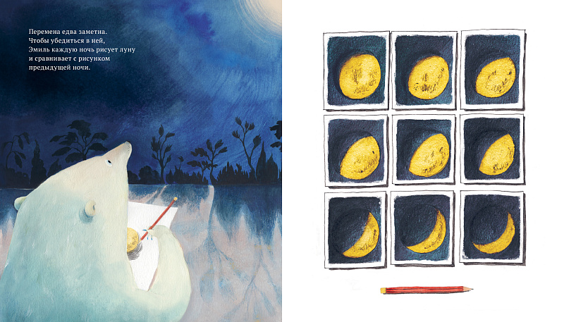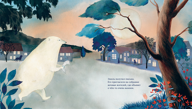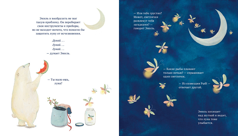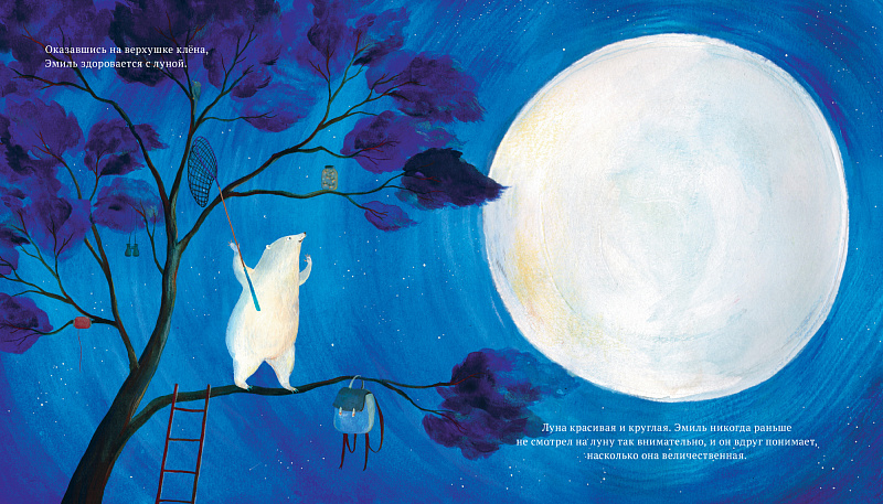 Ночь за ночью Эмиль присматривает за луной, расчищает облака и отгоняет летучих мышей, когда те играют слишком близко. Эмилю нравится говорить с луной в ночной тиши.