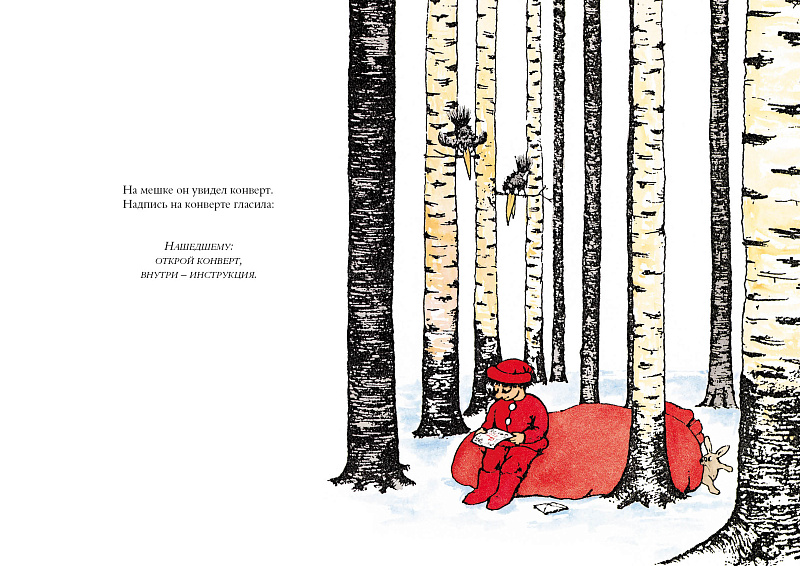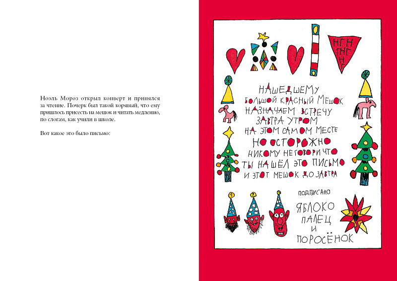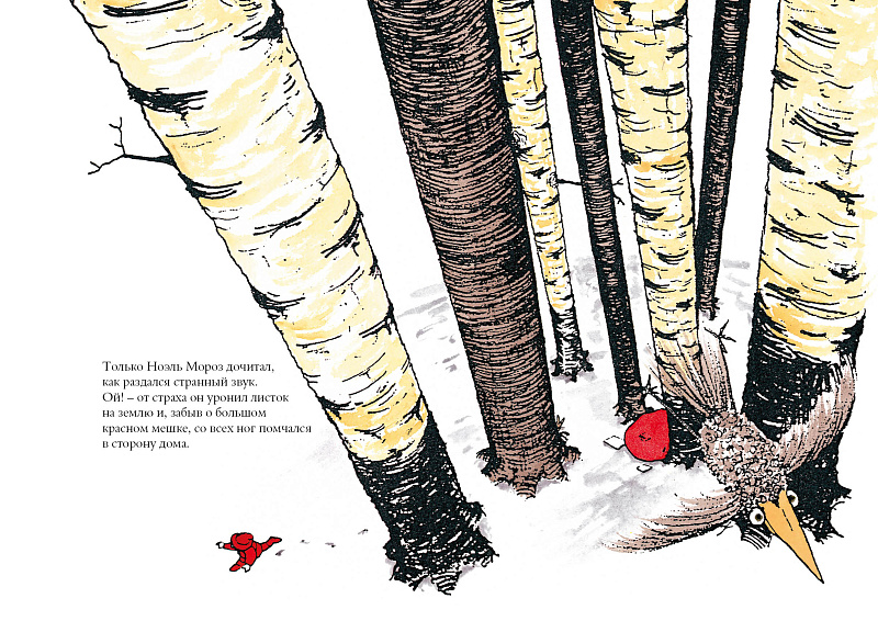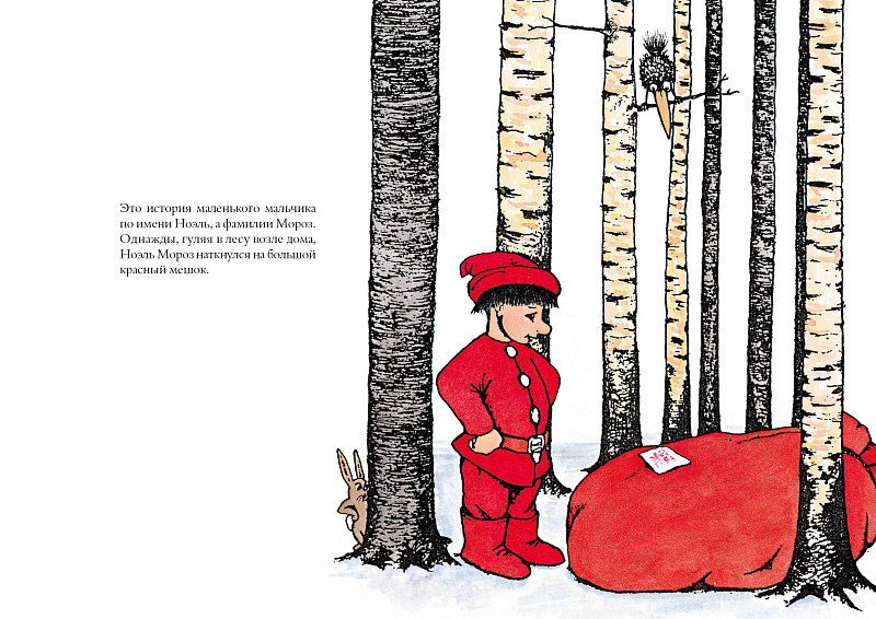«Это история маленького мальчика по имени Ноэль, а фамилии Мороз. Однажды, гуляя в лесу возле дома, Ноэль Мороз наткнулся на большой красный мешок».