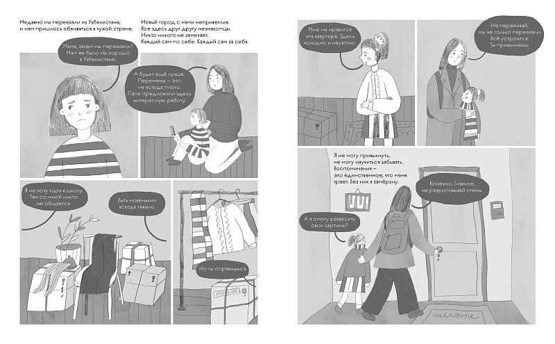 Воспоминания сплетаются в узор, в причудливый орнамент, за которым угадывается далёкая солнечная страна. Страна, из которой Аля уехала в шесть лет. Страна, где остались те, кто был ей дорог. Шумные базары и узкие улочки дружелюбного Ташкента сменили широкие проспекты серого города. И вот уже Але и её семье приходится обживать новый дом, покорять другую страну, осваивать незнакомый чёрно-белый мир, который пришёл на смену старому — расцвеченному яркими красками. Как жить тем, кто уезжает, и тем, кто остаётся? Как смотреть в будущее, если хочется вернуться в прошлое? И как научиться принимать новое, оставаясь самим собой?