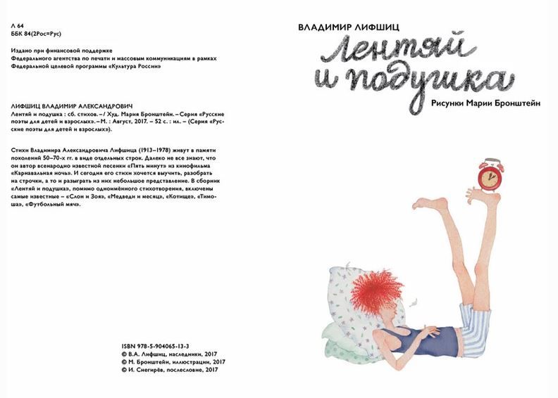 <p> Стихи Владимира Александровича Лифшица (1913-1978) живут в памяти поколений 50-70-х гг. в виде отдельных строк. Далеко не все знают, что он автор всенародно известной песенки "Пять минут" из кинофильма "Карнавальная ночь". И сегодня его стихи хочется выучить, разобрать на строчки, а то и разыграть из них небольшое представление. В сборник «Лентяй с подушкой», помимо одноимённого стихотворения, включены самые известные - «Слон и Зоя», «Медведи и месяц», «Котище», «Тимоша», «Футбольный мяч». </p> <p> </p> <p> «Владимир Александрович Лифшиц (1913–1978) – не из тех поэтов, чьё имя держится на слуху. Когда начинаешь о нём говорить, спрашивают:<br> – Лифшиц? А что он написал?<br> Странно, но на это можно ответить так:<br> – О, это очень интересный поэт. Он написал почти всё.<br> <br> Странность в том, что мало у какого другого поэта стихи так умеют обойтись без автора. Прочитав его стихи для детей, я, например, обнаружил, что строчки «Наш Котище — кот приметный, потому что он трёхцветный» тоже принадлежат Владимиру Лифшицу. В детстве я считал их народной присказкой, чем-то вроде анонимной считалочки, а это из его стихотворения «Котище». Стихотворение прекрасное, как и само слово «котище»».<br> <br> Илья Снегирев, «Владимир Лифшиц. Поэт, который написал почти всё» </p>