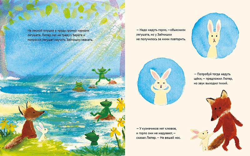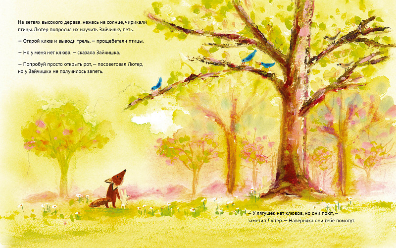 Наконец-то лето! Можно целый день лежать в тени деревьев и слушать, как щебечут птицы, квакают лягушки и стрекочут кузнечики. Но подождите, кто это плачет? Это Зайчишка, она расстроилась, потому что ничего не умеет: ни щебетать, ни квакать, ни стрекотать. Лисёнок Лютер уверен, что всему можно научиться. Вместе они устроят великолепное представление!