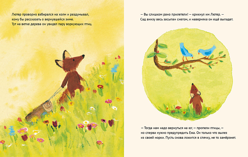 Лисёнок Лютер радостно мчится по залитым солнцем цветущим холмам. Наконец-то природа просыпается! Но что это? Лютер не может поверить глазам: весь сад усыпан снегом. Может, весна вовсе и не наступила? Ему надо срочно предупредить друзей: птицам придётся возвращаться в тёплые страны, Бельчонку —заново собирать припасы, а Ежу — опять ложиться в спячку. Но точно ли в саду снег?