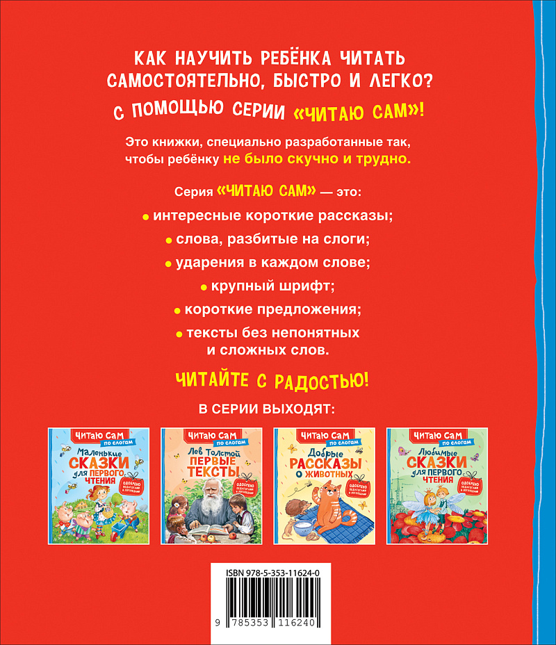 <p> Как научить ребёнка читать самостоятельно, быстро и легко? С помощью серии «Читаю сам»! Это книжки, специально разработанные так, чтобы ребёнку не было скучно и трудно.<br> Серия «Читаю сам» — это:<br> </p> <ul> <li>интересные короткие рассказы;</li> <li>слова, разбитые на слоги;</li> <li>ударения в каждом слове;</li> <li>крупный шрифт;</li> <li>короткие предложения;</li> <li>тексты без непонятных и сложных слов.</li> </ul> Читайте с радостью! <p> </p>