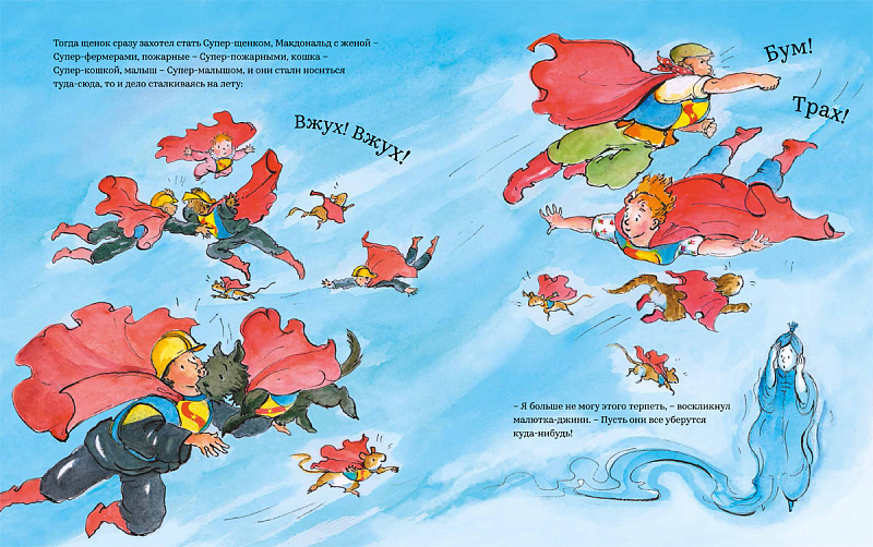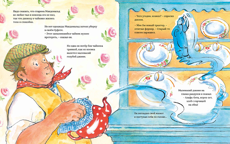 У старого Макдональда была ферма. "Очень много работы на ферме. Вот если б жену - она бы мне помогла", -мечтал старина Макдональд. Поэтому, когда он обнаруживает, что в его чайнике прячется маленький джинн, то первым делом просит у волшебника миссис Макдональд. Миссис Макдональд просит у джинна малыша, малыш просит щенка, который просит кошку, которая просит мышей. Мыши просят футбольный мяч и большой громкий свисток, и очень скоро на ферме становится невыносимо шумно и тесно. Сможет ли джинн когда-нибудь опять вздохнуть свободно? Вот если бы нашёлся кто-нибудь, кто исполнил бы его желание: ведь джинны ничего не могут пожелать для себя - только для других.