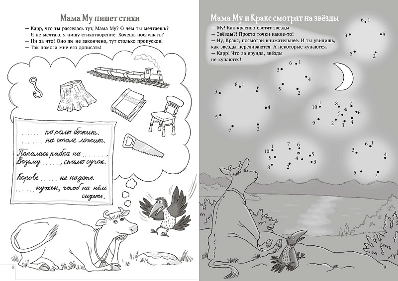 Нечем заняться? Присоединяйся к Маме Му и Краксу! Вместе вы сможете играть в следопытов и тайных агентов, нырять, качаться на качелях, решать кроссворды, искать батарейки и всякую всячину, учить буквы, летать, кататься на велосипеде, строить, отдыхать, изобретать, раскрашивать, светить фонариком, устраивать пикники, мечтать, писать стихи, смотреть на звёзды, изображать разных животных, рыбачить, наводить порядок, собирать цветы и танцевать.