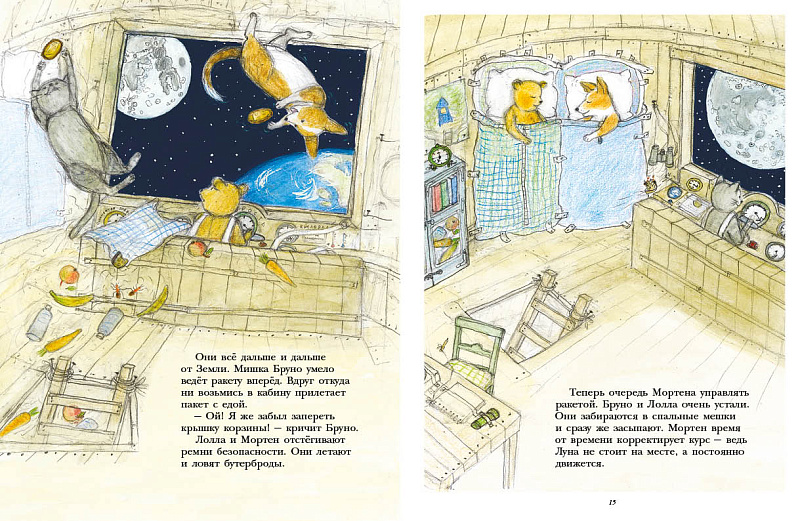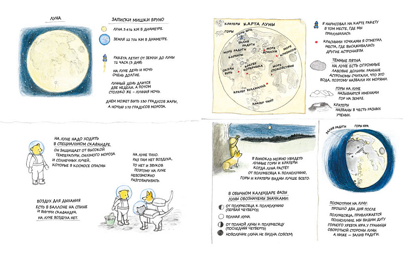 В конце книги читателя ждет особая познавательная часть — «Записки мишки Бруно». Там есть карта Луны, сведения о ее размерах и географии, а также доступное объяснение того, что такое сила земного притяжения и почему Луна видна нам то целиком, то лишь наполовину, а то и вовсе не видна.
