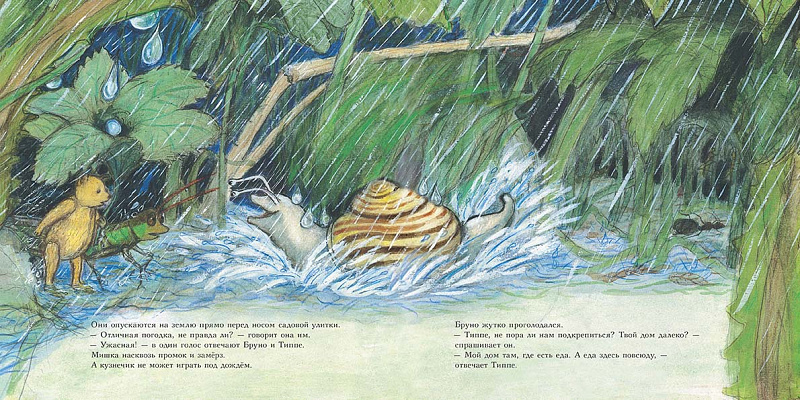 Сборник «Мишка Бруно в саду» продолжает серию познавательных книжек-картинок, созданных известной шведской писательницей и иллюстратором Гуниллой Ингвес. В книгу вошли две истории: «Мишка Бруно и дождевой червяк Уффе» и «Мишка Бруно и кузнечик Типпе».<br> <br> В первой истории мишка Бруно гуляет по саду и замечает на грядке с редиской странную кучку земли. Отодвинув ее лапой, он видит подземный ход. Вот бы туда проникнуть! Любознательный мишка, когда захочет, может делаться маленьким. Как? Это его секрет! Став мишкой-крошкой, он скатывается под землю и падает прямо на дождевого червяка Уффе. Когда Уффе приходит в себя от потрясения, он показывает мишке свои владения и знакомит со своими друзьями ногохвостками. А мишка спасает червяка от свирепой многоножки и помогает ему пополнить запасы еды. Свои наблюдения мишка потом аккуратно заносит в дневник. Мишкины записки и рисунки занимают четыре страницы: подземные владения Уффе в разрезе, образ жизни дождевых червей, строение тела и способ размножения, их друзья и враги, а также польза, которую они приносят саду.<br> <br> Во второй истории мишка Бруно и собака Лолла сидят в саду и слушают стрекотание кузнечиков. Мишке очень любопытно, как у них получается такая музыка. Он становится размером с кузнечика и знакомится с Типпе. Тот показывает мишке, как они стрекочут, и вместе они отправляются искать Типпе невесту. На полном ходу друзья врезаются в липкую паутину и вот-вот станут добычей ядовитого паука. Но тут прибегает Лолла и разрывает сети. День заканчивается веселой свадьбой в саду у мишки Бруно. Потом мишка заносит в свой дневник все, что он увидел и узнал во время этой прогулки. Четыре страницы пестрят его заметками и рисунками о семействе зеленых травянок, к которому принадлежит Типпе, — их образе жизни, размножении, друзьях и врагах.<br> <br> Книги о мишке Бруно с нежными иллюстрациями, множеством деталей на каждой странице и обаятельными героями учат детей 3-6 лет понимать природу.<br>