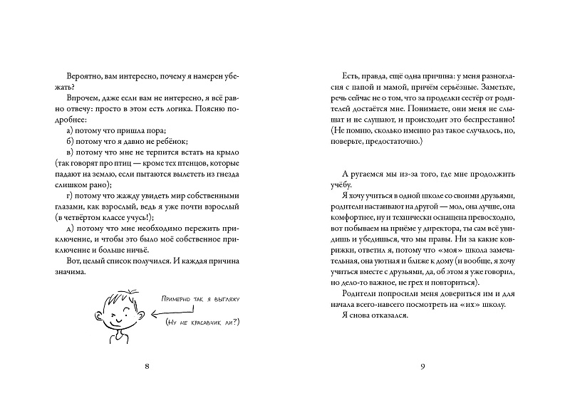 <p> Решено, я убегу из дома. Меня зовут Гаспар, мне десять лет (ладно, почти десять). Так что послезавтра или послепослезавтра я отправлюсь покорять мир (ладно, попытаюсь это сделать). Но сперва я должен всё организовать, и у меня много вопросов: </p> <p> — Куда поехать? На необитаемый остров, в город, в лес? </p> <p> — На день, на два дня, на неделю?  </p> <p> — Что взять с собой? (И сколько пар носков?)  </p> <p> — Посвятить ли друзей в свои планы?  </p> <p> — Если в нашей округе водятся волки, как от них прятаться?  </p> <p> — А есть я что буду?  </p> <p> Потому что к приключениям нужно готовиться. Все искатели приключений это знают. </p> <p> Перед вами — смешной и очень честный рассказ от первого лица, с одной стороны, о стремлении к самостоятельности, с другой — об ответственности и привязанности к родителям. </p>