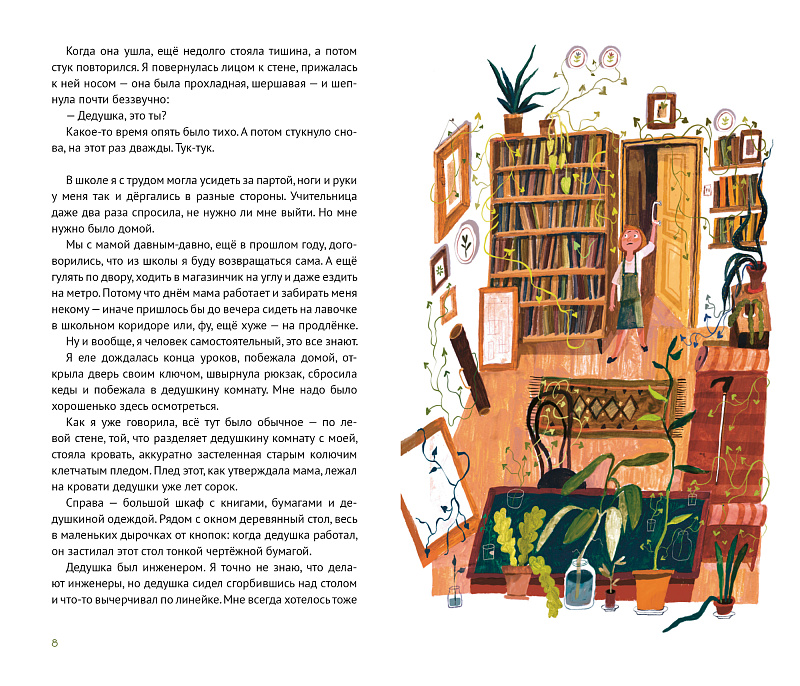 <p> У Симы совсем нет друзей, зато есть мама. А еще — дедушка, бывший инженер, который с годами превратился в ворчливого старичка, увлеченного только комнатными растениями и огородом. </p> <p> Когда дедушки не стало, девочка слышит из его комнаты загадочный стук и понимает, что тот стал призраком. В квартире меж тем происходят странные вещи: дедушкины герани, плющи и бегонии начинают разрастаться по всему жилищу, превращая его в джунгли. </p> <p> Сима знает, что привидения появляются, если человек не успел сделать при жизни что-то важное. Теперь она должна выяснить, зачем вернулся дедушка и чем она может ему помочь, но самое главное — остановить растения, которые вот-вот захватят дом. </p> <p> Жизнеутверждающая история с элементами детектива и мистики о проживании горя и утраты, о том, что близкие люди навсегда остаются с нами. </p>