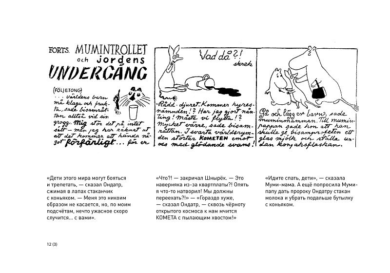 Истории о муми-троллях, созданные Туве Янссон, снискали заслуженную славу у российского читателя, и сегодня почитатели таланта знаменитой шведоязычной писательницы из Финляндии имеют возможность прикоснуться к малоизвестной в России стороне ее творчества – комиксу. История в картинках «Муми-тролль и конец света» публиковалась в газете Ny Tid в 1947-1948 годах и в оригинальной форме излагает сюжет о космической угрозе миру и чудесном его спасении.
