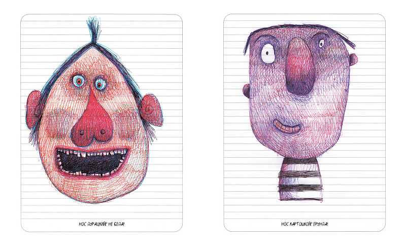 «Ну и что?» невозможно читать быстро. Взгляд постоянно останавливается на каждом рисунке. Художественный текст расширяется, заставляя нас окунаться в воспоминания, возвращаться к тому времени, когда мы тоже рисовали рожицы на тетрадных листах.(…) Калейдоскоп персонажей сменяется, на линованной бумаге проступают носы, волосы, шеи, зубы. Мы снова оказываемся в том времени, когда мир волновал нас, удивлял, заставлял запечатлевать на бумаге все комичное, странное, несуразное и прекрасное».