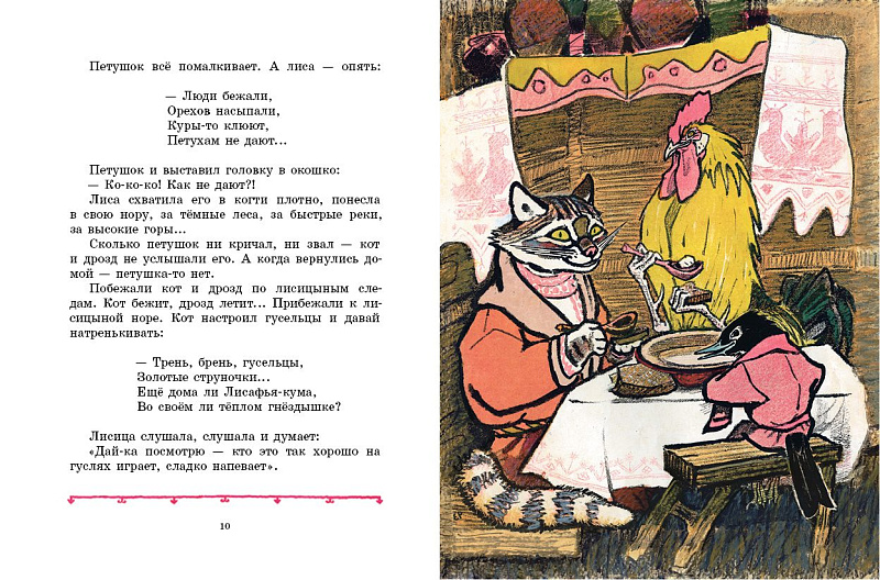 Всё в этой книжке педагогически полезно и художественно прекрасно.<br> <br> Во-первых, динамичный и поучительный сюжет о глуповатом петушке, который трижды попадался на лисьи уловки и оказывался у неё в лапах. Хорошо, что надёжные друзья кот и дрозд каждый раз выручали его из беды.<br> Во-вторых, великолепный русский язык и ясное, понятное детям изложение всех драматических событий сказки, исполненное Алексеем Николаевичем Толстым, разносторонним литератором, талантливейшим обработчиком сказок.<br> В-третьих, гениальные, единственные в своём роде иллюстрации художника-анималиста Евгения Михайловича Рачёва. «Рачёвские» животные полностью сохраняют природную пластику. Но благодаря тому, что все они одеты в русские национальные костюмы, ходят и сидят, как люди, а на мордах у них самые разнообразные выражения, в них легко угадывается намёк на человеческие характеры и отношения. Например, лиса: сразу видно — ласковая такая, а добра от неё не жди — наглая обманщица, хитрюга.<br> <br> Рекомендуется для чтения взрослыми детям младшего возраста, а также для совместного обсуждения и рассматривания прекрасных, ярких иллюстраций.<br>