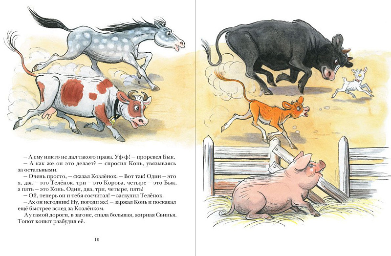 Главный герой сказки известного норвежского поэта писателя и композитора Альфа Прёйсена — Козлёнок, который научился считать до десяти. Ему не терпится применить свои знания на практике, поэтому во время прогулки он присваивает порядковые номера всем, кого встречает по пути: «Один — это я, два — это Телёнок, три — это Корова. Один, два, три!» Посчитанные Козлёнком персонажи в силу своего невежества обижаются и хотят во что бы то ни стало наказать Козлёнка за самоуправство. Компания недовольных увеличивается с каждой страницей книжки. Они дружно бегут за Козлёнком, намереваясь его побить (или вразумить), чтобы впредь неповадно было посягать на личную свободу граждан.<br> <br> Козлёнок шустро убегает от преследователей, уверенный в своей правоте и своём праве считать всех попадающихся на пути. Бегущая следом толпа зверей всякий раз приостанавливается, чтобы объяснить вновь встреченному персонажу, насколько сильно его обидели, оскорбили и унизили. В конце концов Козлёнок взбегает на парусный кораблик, стоящий у причала. Все устремляются за ним. Кораблик покачнулся, все запаниковали, кажется – ещё минута и все пойдут ко дну. И тут капитан объявляет, что кораблик рассчитан на десятерых и кто-то должен срочно пересчитать пассажиров.<br> <br> Вот и настал звёздный час Козлёнка! Он еще раз всех пересчитывает. Как только выясняется, что их ровно десять, качка волшебным образом прекращается и корабль перестаёт тонуть. Все испытывают к Козлёнку искреннюю благодарность. На последней странице – ожидаемый хэппи-энд. Талант Козлёнка находит достойное применение: он становится контролёром – считает пассажиров, поднимающихся на борт кораблика.<br> <br> Иллюстрации гениального художника Владимира Сутеева к книге – выше всех похвал! Рекомендуется для чтения взрослыми детям младшего дошкольного возраста, совместного рассматривания превосходных картинок и освоения малышами начального счёта.<br>