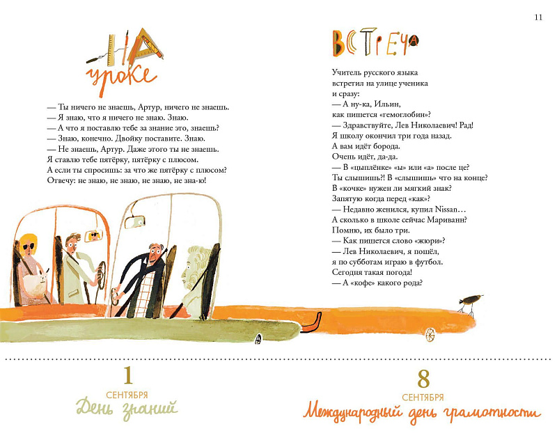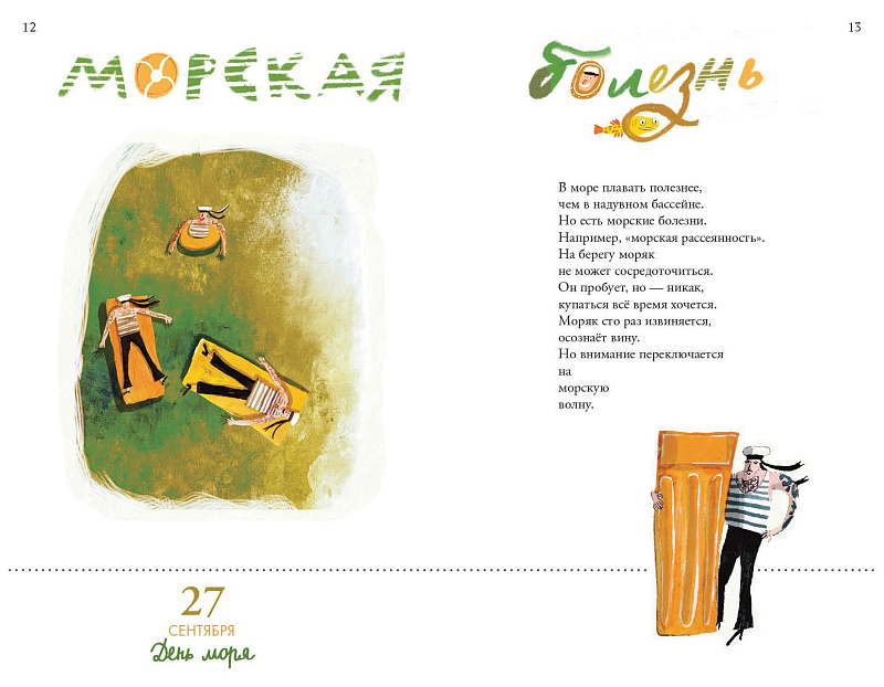 <p> Если в вашей жизни не хватает веселья и праздников, то эта книга стихов Артура Гиваргизова придётся как нельзя кстати! </p> <p> День здорового питания, День студента и Всемирный день пчёл — кажется, эти даты давно пора отметить в календаре красным и начать от души их праздновать. Тем более, что по каждому торжественному поводу поэт Артур Гиваргизов сочинил особое стихотворение. Например, для Дня космонавтики: </p> <div> <i>Саша и Таня — дети как дети,</i><br> <i> </i><i> Только папа у них марсианин. </i><br> <i> </i><i> Саша и Таня меняются в цвете </i><br> <i> </i><i> (особенно уши у Тани) </i><br> <i> </i><i> Перед контрольной (обычное дело) — </i><br> <i> </i><i> Сильно краснеют. А Вадик, </i><br> <i> </i><i> Он по-другому — становится белым. </i><br> <i> </i><i> У Вадика папа лунатик.</i> </div> <p> </p> <p> Эта книга — прекрасный подарок для тех, кто хотел бы радоваться каждому дню, но не всегда может найти для этого повод. А ещё она может вдохновить на создание собственного календаря радостей! </p>