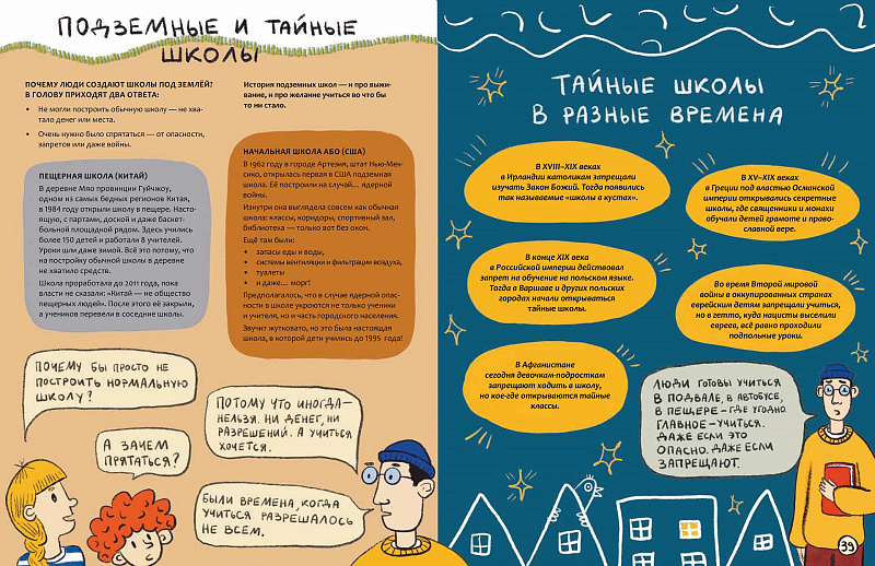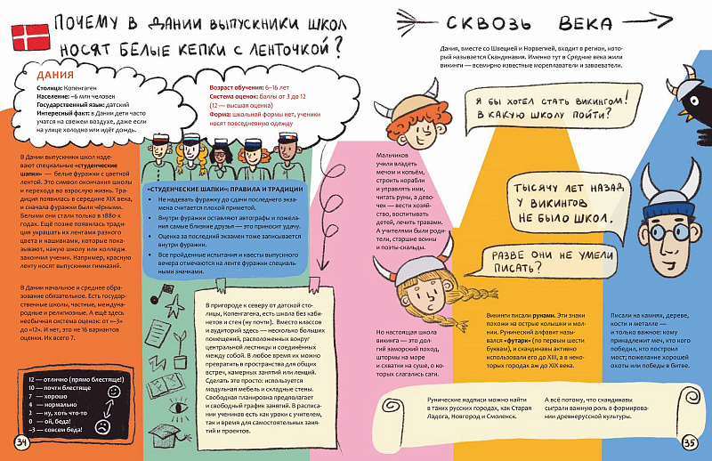 <p> Эта книга — путеводитель по самым удивительным, весёлым и вдохновляющим школам мира. Ты заглянешь в классы более чем двадцати стран, побываешь в школе под землёй, на огромной высоте, встретишь пингвинов и научишься вежливо здороваться с кенгуру! Узнаешь, где до сих пор пишут палочкой, а где разрешают поспать прямо за партой, почему форма в Аргентине похожа на халат врача и как проходит школьный день на острове Бали. А ещё тебя ждут простые и увлекательные мастер-классы под рубрикой «Создай-ка!», путешествия «Сквозь века» — экскурсы в историю образования, и коллекция полезных лайфхаков на все случаи жизни «Это важно!» </p>