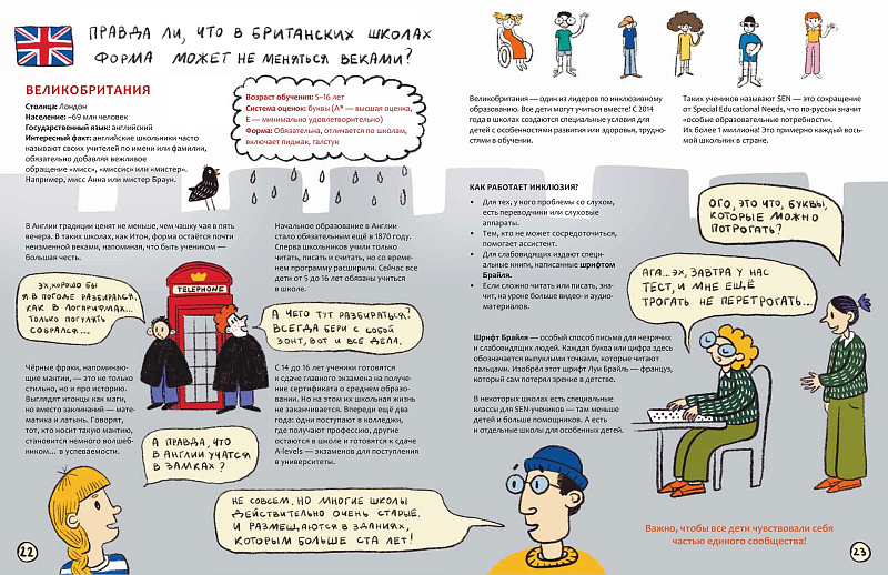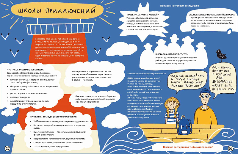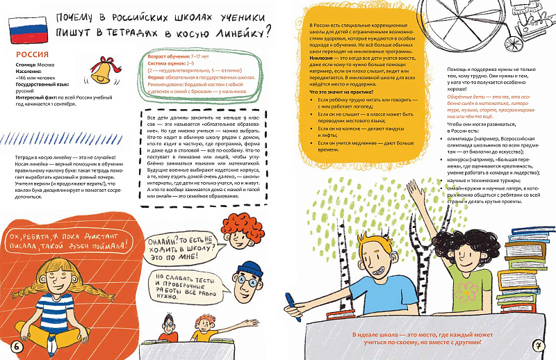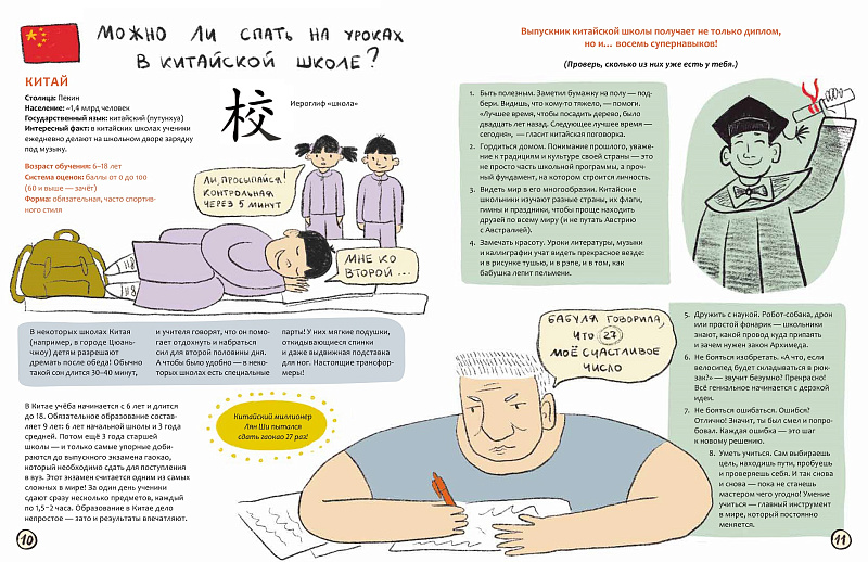Эта книга — путеводитель по самым удивительным, весёлым и вдохновляющим школам мира. Ты заглянешь в классы более чем двадцати стран, побываешь в школе под землёй, на огромной высоте, встретишь пингвинов и научишься вежливо здороваться с кенгуру! Узнаешь, где до сих пор пишут палочкой, а где разрешают поспать прямо за партой, почему форма в Аргентине похожа на халат врача и как проходит школьный день на острове Бали. А ещё тебя ждут простые и увлекательные мастер-классы под рубрикой «Создай-ка!», путешествия «Сквозь века» — экскурсы в историю образования, и коллекция полезных лайфхаков на все случаи жизни «Это важно!»