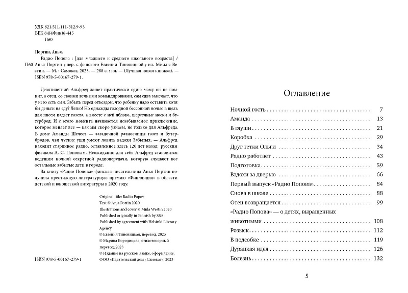 <p> В свои девять лет Альфред слишком хорошо знает, что такое одиночество. Мамы у него нет, отец вечно где-то пропадает, а если он и появляется дома, то не обращает на Альфреда никакого внимания и забывает даже оставить ему деньги на еду. Альфред привык со всем справляться сам. Но однажды ночью случается невероятное: в щель для писем кто-то бросает газету, в которую завернуты шерстяные носки, яблоко и бутерброд! Так Альфред знакомится с Амандой Шелест, чей чуткий слух ловит вздохи Забытых детей, и в ее доме находит старинное радио. И тогда Альфреду приходит в голову идея: почему бы не начать вести секретную радиопередачу для всех остальных забытых, как он сам, детей? </p> <h2>5 причин купить книгу «Радио Попова»:</h2> <ul> <li> <p> Трогательная и душевная книга, которая напоминает о любимой классике детской литературы, такой как романы-сказки Роальда Даля и Астрид Линдгрен; </p> </li> <li> <p> Книга переведена на 25 языков, удостоена престижной литературной премии Finlandia в 2020 году;<br> </p> </li> <li> <p> История, которая не оставит равнодушными ни детей, ни взрослых;<br> </p> </li> <li> <p> Реалистичный сюжет с капелькой волшебства;<br> </p> </li> <li>Перевод с финского Евгении Тиновицкой.<br> </li> </ul> <p> <b> ЦИТАТЫ ИЗ КНИГИ: </b> </p> <p> <i>«Приветствую вас, дорогие слушатели, в эфире первый выпуск передачи «Радио Попова», и я, Альфред, ее ведущий. Кто бы ты ни был, теперь ты можешь слушать наши выпуски по субботам в это самое время и наверняка узнаешь что-то новое. Каждую субботу мы будем встречаться на радиоволнах под покровом ночи, когда слова летят на свет, как маленькие серые мотыльки. Раскрой пошире уши, мы начинаем!»</i> </p> <p> <i>«— У его родителей много проблем, — продолжала Аманда. — Эти проблемы — как темные горы, мальчик все время в их тени. Поэтому он относится к категории средней тяжести, как и бо́льшая часть Забытых. Тяжелых случаев, к счастью, мало». </i> </p> <p> <i>«Иногда кажется, что тебя никто не слушает, но помни — в мире всегда есть кто-то, кто услышит. Кто-то, кто думает о тебе, когда ты закрываешь глаза и ложишься спать».</i> </p>
