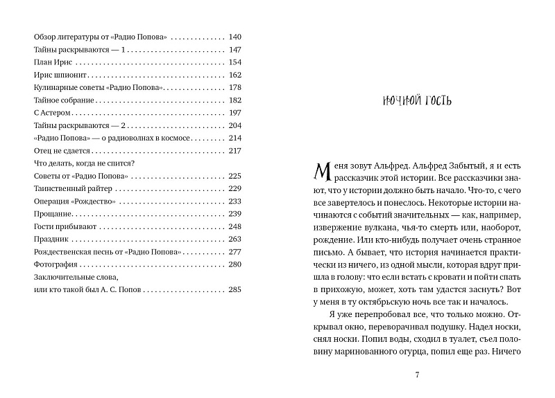 «Приветствую вас, дорогие слушатели, в эфире первый выпуск передачи «Радио Попова», и я, Альфред, ее ведущий. Кто бы ты ни был, теперь ты можешь слушать наши выпуски по субботам в это самое время и наверняка узнаешь что-то новое. Каждую субботу мы будем встречаться на радиоволнах под покровом ночи, когда слова летят на свет, как маленькие серые мотыльки. Раскрой пошире уши, мы начинаем!»