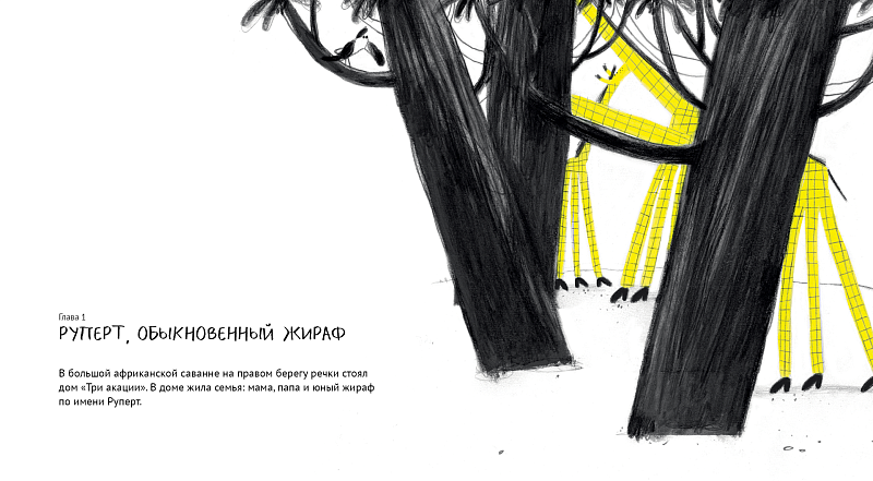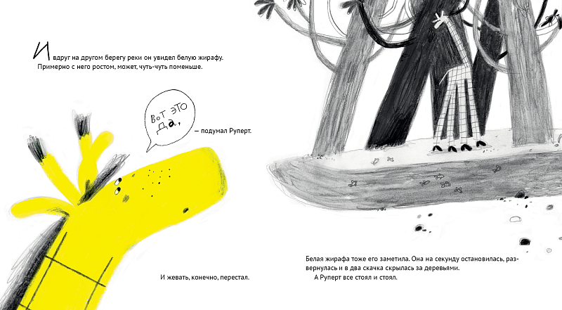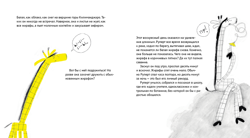 <p> Как трудно жить, когда ты самый обыкновенный, ничем не примечательный жираф. Но еще труднее, если ты жираф необыкновенный, ни на кого не похожий. Хорошо, что мы все разные, а то было бы скучно. И хорошо, что мы умеем дружить. </p> <p> Жираф Руперт ходит в звериную школу. Однажды в его классе появляется новая ученица — белая жирафа Бланка. Руперт восхищен удивительным окрасом новенькой и хочет во что бы то ни стало ей понравиться. Но что для этого нужно? Хобот, как у слона? Крылья, как у попугая? А может, львиная грива? Бланка же втайне мечтает стать самой обыкновенной жирафой. Звери встречаются на дне рождения гепарда, где их ждет большой сюрприз, который все расставит по своим местам. </p> <p> «Пока я писала эту книжку, успела почувствовать себя всем героями по очереди, вот только слоном не вышло. Но если, например, связать подходящий хобот… Как думаете, тогда получится?»<br> — Ольга Василькова </p>