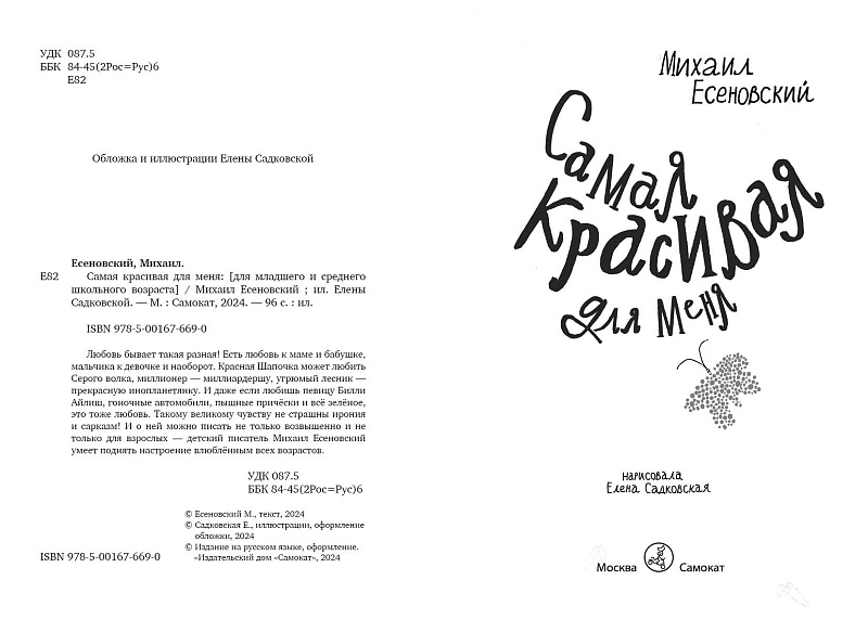 <p> Любовь бывает такая разная! Есть любовь к маме и бабушке, мальчика к девочке и наоборот. Красная Шапочка может любить Серого Волка, миллионер — миллиардершу, угрюмый лесник — прекрасную инопланетянку. И даже если любишь певицу Билли Айлиш, гоночные автомобили, пышные причёски и всё зелёное, это тоже любовь. Такому великому чувству не страшны ирония и сарказм! И о нём можно писать не только возвышенно и не только для взрослых — детский писатель Михаил Есеновский умеет поднять настроение влюблённым всех возрастов. </p> <h2>5 причин купить книгу «Самая красивая для меня»:</h2> <ul> <li> <p> Идеальный способ говорить о любви с детьми, которые, переходя из детства в подростковый возраст, вдобавок к любви к мамам и бабушкам открывают для себя настоящее, серьёзное чувство. Ещё остерегаются, но уже интересуются; </p> </li> <li> <p> Заинтересует нечитающих детей: короткие рассказы на волнующую тему написаны легким смешным языком; </p> </li> <li> <p> Тонкая ирония, сарказм, парадоксы — юмор Михаила Есеновского упрощает разговор о любви и понятен всем от 9 до 99 лет! Причем дети поймут своё, взрослые — своё; </p> </li> <li> <p> В «Самокате» выходит вторая книга «последнего советского детского писателя» Михаила Есеновского (первая — «Гипноз Иванович»); </p> </li> <li> <p> Книга проиллюстрирована смешными, остроумными рисунками Елены Садковской. </p> </li> </ul> <p> </p> <p> <b>ЦИТАТЫ ИЗ КНИГИ:</b> </p> <p> <i>«Раньше не было так много народу. Раньше были только мама, папа и я. Иногда ещё была бабушка. А теперь просто чёрт знает что такое. Кругом одни люди, и совершенно никому не известные. Например, вчера мимо меня прошёл человек, которого (я совершенно в этом уверен) никто никогда не видел до этого. Откуда он, спрашивается, взялся? Никому не известно! Раньше такого не было.»</i> </p> <p> <i>«— Ты меня любишь? </i> </p> <i> </i> <p> <i> — Конечно. </i> </p> <i> </i> <p> <i> — Что значит «конечно»? </i> </p> <i> </i> <p> <i> — Конечно да. </i> </p> <i> </i> <p> <i> — Что значит «да»? Нельзя, что ли, просто сказать «люблю»? </i> </p> <i> </i> <p> <i> — Можно. </i> </p> <i> </i> <p> <i> — Так почему же ты не говоришь? </i> </p> <i> </i> <p> <i> — Я сказала. </i> </p> <i> </i> <p> <i> — Что ты сказала? </i> </p> <i> </i> <p> <i> — «Конечно». И ещё «да». </i> </p> <i> </i> <p> <i> — Значит, любишь? А сильно? </i> </p> <i> </i> <p> <i> — Как Фиона Шрека. </i> </p> <i> </i> <p> <i> — По-твоему, у меня нездоровый цвет лица?»</i> </p>