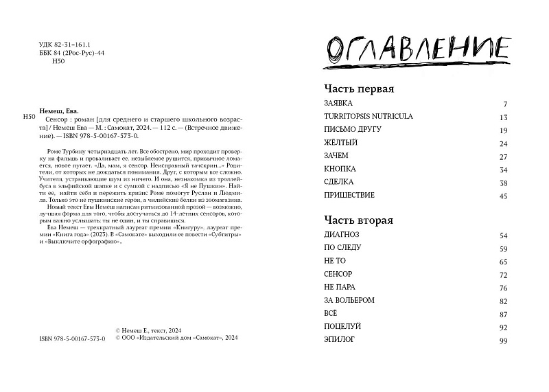 Роме Турбину четырнадцать лет. Всё обострено, мир проходит проверку на фальшь и проваливает её, незыблемое рушится, привычное ломается, новое пугает. «Да, мам, я сенсор. Неисправный тачскрин...» Родители, от которых не дождаться понимания. Друг, с которым все сложно. Учителя, устраивающие шум из ничего. И она, незнакомка из троллейбуса в эльфийской шапке и с сумкой с надписью «Я не Пушкин». Найти её, найти себя и пережить кризис Роме помогут Руслан и Людмила. Только это не пушкинские герои, а чилийские белки из зоомагазина. Новый текст Евы Немеш написан ритмизованной прозой — возможно, лучшая форма для того, чтобы достучаться до 14-летних сенсоров, которым важно услышать: ты не один, и ты справишься. Ева Немеш — трехкратный лауреат премии «Книгуру», лауреат премии «Книга года» (2023). В Самокате» выходили её повести «Субтитры» и «Выключите орфографию».