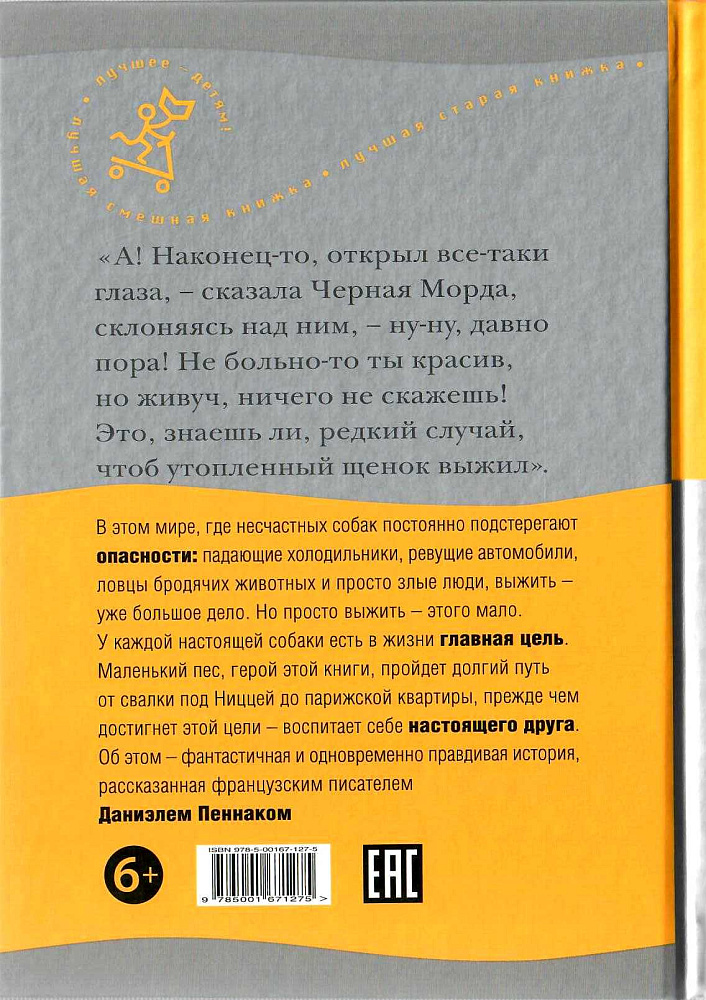 В этом мире, где несчастных собак постоянно подстерегают опасности: падающие холодильники, ревущие автомобили, ловцы бродячих животных и просто злые люди, выжить — уже большое дело. Но просто выжить — мало. У каждой настоящей собаки есть в жизни главная цель. Маленький пес, герой этой книги, пройдет долгий путь от свалки под Ниццей до парижской квартиры, прежде чем достигнет этой цели — воспитает себе настоящего друга.