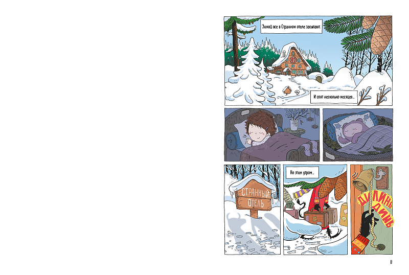 Странный отель — это обычный отель, только… немного странный. Управляют им бесстрашная девочка Мариэтта и симпатичные загадочные существа: безумный философ месье Леклер, привидение месье Снарф и маленький беспокойный монстр по имени Кики. А на страницах книги встречаются тревожники, кровососы, ворчуны и Большой Бурч. Мариэтте и компании нужно разыскать куда-то запропастившегося дядюшку Весну, потому что иначе зима не закончится, и она отправляется на поиски огромного сапфира, который был похищен у разбойников.