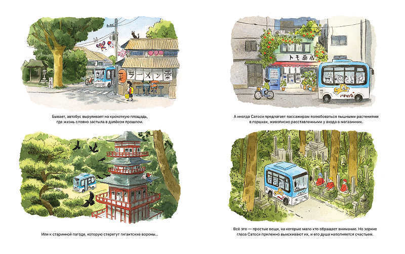 <p> Сатоси живёт в Токио и водит небольшой автобус. Колесить проторённым маршрутом ему скучно, и он частенько заруливает в неприметные переулки. Взорам пассажиров предстают подлинные сокровища, прячущиеся от суеты центральных проспектов. Вот величественный храм посреди живописного парка, вот улочка, украшенная необыкновенными растениями и цветами, а вот дорожка с оригинальными статуями...  </p> <p> В компании Сатоси шумный город превращается в волшебное место. </p>