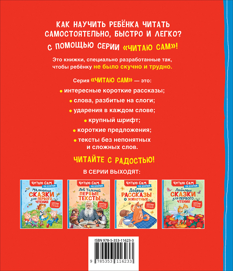 <p> Как научить ребёнка читать самостоятельно, быстро и легко? С помощью серии «Читаю сам»! Это книжки, специально разработанные так, чтобы ребёнку не было скучно и трудно.<br> Серия «Читаю сам» — это:<br> </p> <ul> <li>интересные короткие рассказы;</li> <li>слова, разбитые на слоги;</li> <li>ударения в каждом слове;</li> <li>крупный шрифт;</li> <li>короткие предложения;</li> <li>тексты без непонятных и сложных слов.</li> </ul> Читайте с радостью! <p> </p>
