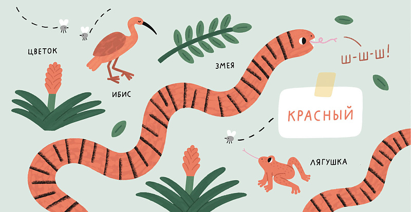 Ещё для работы мы собрали базу из животных и растений разных цветов, так что все персонажи книги «Цвета» существуют на самом деле. Вот самые необычные из них: клубничная ядовитая лягушка, бразильский лунный уж, сумеречная саламандра, яблочная улитка, ольховый листоед, горный мадагаскарский хамелеон.