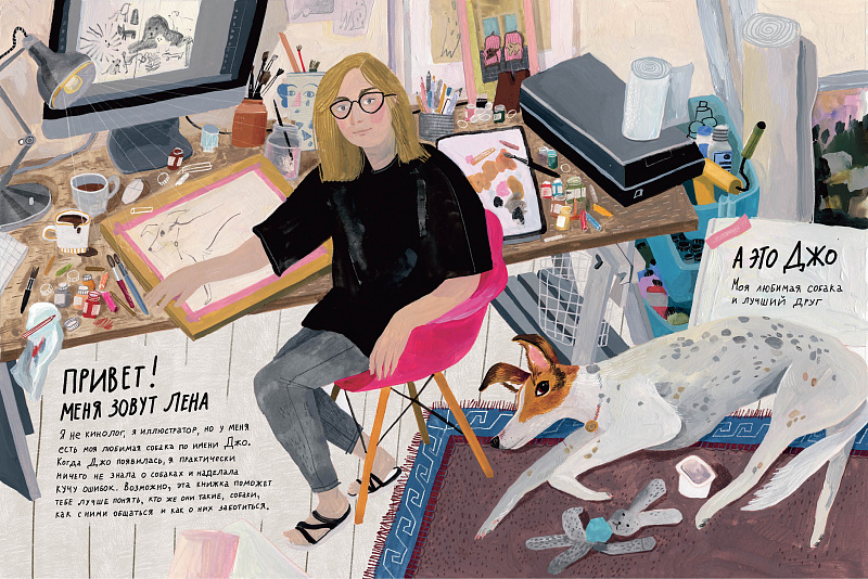 Идея книги появилась в 2017 году, как студенческий проект на курсе иллюстрации Виктора Меламеда в Британской Высшей Школе Дизайна, где я училась. Проект прошел в финал конкурса издательства «Самокат» “Книга внутри”, но закончить книгу я тогда не смогла, не осилила огромный объем работы. В 2019 году я решила вернуться к «Собаке» и рисовала иллюстрации вплоть до весны 22 года. Книга стала больше по формату, а главное — кроме полезной информации про собак в ней появилась моя личная история.