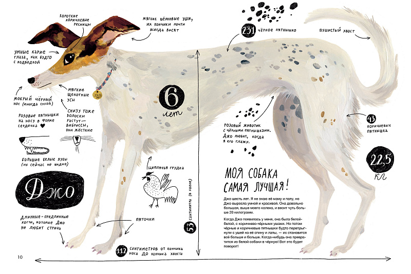 Примерно 70-80% собак в книге нарисованы с настоящих собак, остальные придуманы из головы. Когда пришла очередь иллюстраций, я поняла, что мне нужно будет нарисовать ооооочень много собак, и я попросила подписчиков прислать фотографии своих собак, которые можно было бы использовать для книжки. Мне пришло больше 800 писем! Несколько тысяч фотографий!