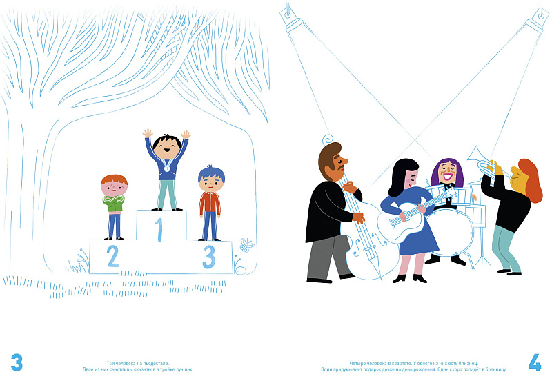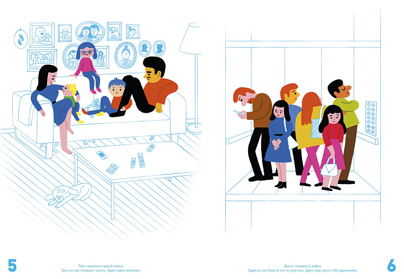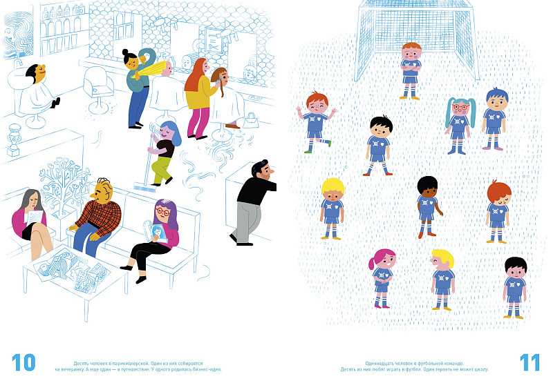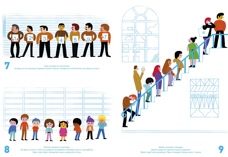 «Все считаются» — это и активити, и искалка, и книга на счет, и одновременно книжка-картинка о человечестве, и о роли каждого в огромном мире. Эта смешная книга научит считать от 0 до 7,5 миллиардов, а еще наблюдать за людьми, переживать с ними вместе разные эмоции и видеть, как переплетаются их истории. Ни один герой не появляется в книжке просто так, каждый — часть чего-то большего: семьи, блошиного рынка или толпы в аэропорту. И все связаны между собой! Легко убедиться, что все в мире очень разные, у всех своя жизнь, и, что еще важнее — что все считаются!