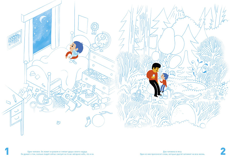 Она начинается картинкой на лесной поляне, чтобы показать ноль или «никого», а затем переходит к обманчиво простому одному (1) ребенку в спальне, который затем присоединяется к своему отцу (2) для прогулки по лесу. Счет продолжается последовательно до 30, а затем различными интервалами - до 1000 - для изображения сцен с участием множества людей в разных местах - от библиотеки до урока рисования, на каждой - множество разных героев (разного телосложения, цвета кожи и с разными прическами). Но - многих из этих героев мы снова встретим на разных разворотах.