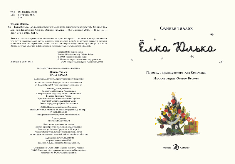 <p> Ёлке Юльке выпало родиться в питомнике на краю автотрассы. Там ёлочки растут так близко, что почти касаются друг друга ветками. Они смотрят в небо и мечтают вырасти самыми высокими, самыми стройными, чтобы попасть на какую-нибудь мебельную фабрику. А ёлка Юлька мечтала об огнях и фейерверках. Ей снилось, как её ветки гнутся под тяжестью шаров и гирлянд, а на верхушке светится огромная звезда. Юлька хотела стать новогодней ёлкой. </p> <h2>5 причин купить книгу «Ёлка Юлька»:</h2> <ul> <li> <p> Новогодняя сказка о мечте, которая кажется недостижимой; </p> </li> <li> <p> Жизнеутверждающая история о том, что твоя судьба все-таки в твоих руках; </p> </li> <li> <p> </p> <p> Иллюстрации любимого художника и мудрого сказочника Оливье Таллека, который умеет оживлять не только дерево, но и самые скучные вещи. </p> </li> <li> <p> </p> <p> Ироничная и психологически точная история про творческие натуры. </p> </li> <li> <p> Книга подходит как для семейного, так и первого самостоятельного чтения. </p> </li> </ul>